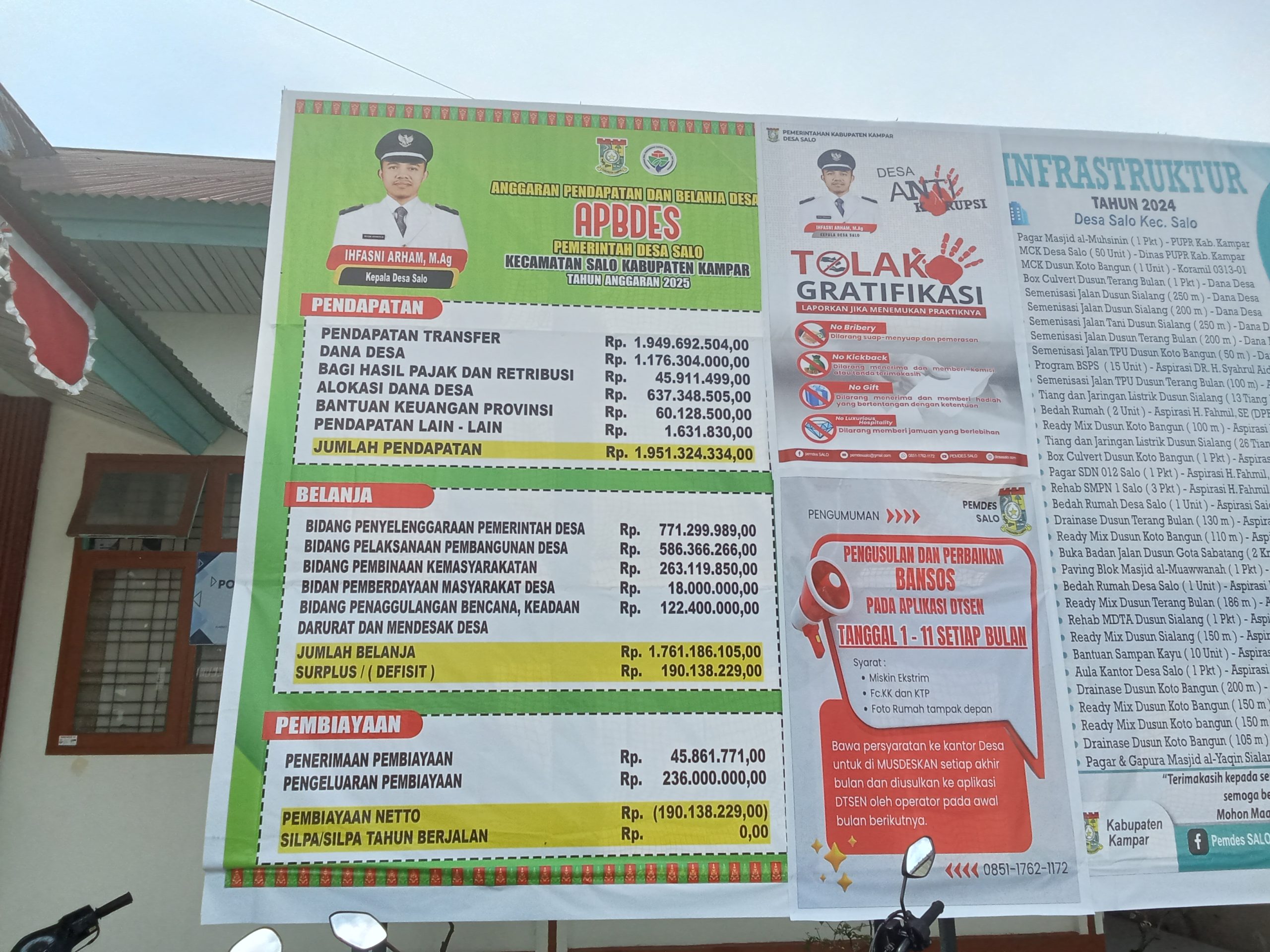 Kampar – Kepala Desa Salo, Kecamatan Salo, Kabupaten Kampar, Ihfazni Arham, M.Ag, kembali menunjukkan komitmennya terhadap keterbukaan informasi publik dengan menampilkan rincian Anggaran Pendapatan dan Belanja Desa (APBDes) Tahun 2025 secara terbuka melalui baliho besar di halaman kantor desa Salo.